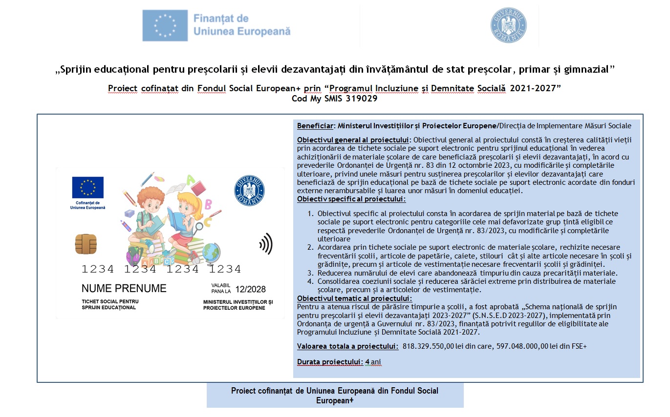 Școala noastră susține accesul egal la educație prin implicarea în proiectul „Sprijin educațional pentru preșcolarii și elevii dezavantajați”, cofinanțat din Fondul Social European+ prin Programul Incluziune și Demnitate Socială 2021–2027.